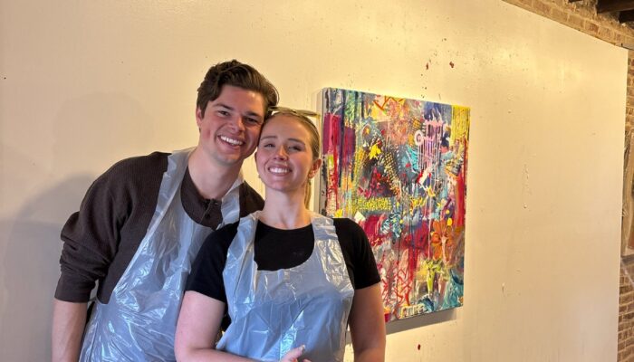 You and your painting partner(s) will collab on one large canvas, so you can make broad gestures and move around during the creative process.