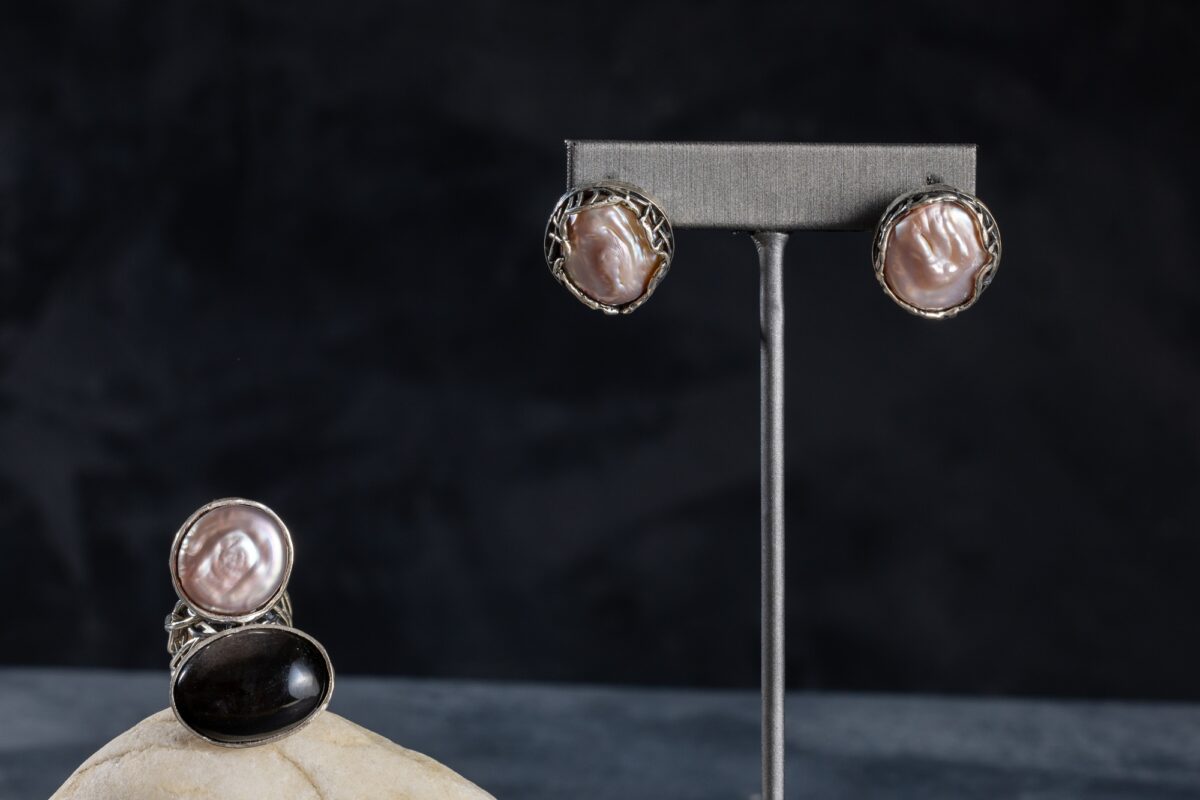 This earring and ring set features Rose baroque pearl and Obsidian.