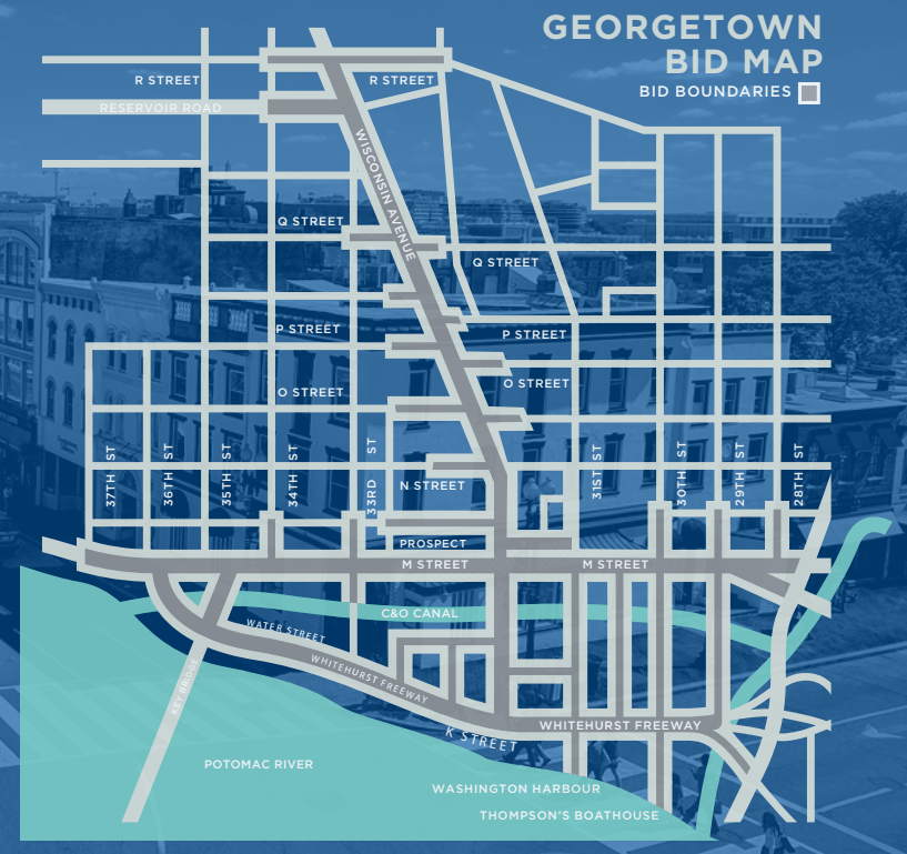 The BID’s boundaries cover approximately 35 blocks of the Georgetown commercial district, including all of the commercial properties on M Street between Canal Road on the west and Rock Creek Parkway on the east, and all properties south of M Street to the Potomac River.