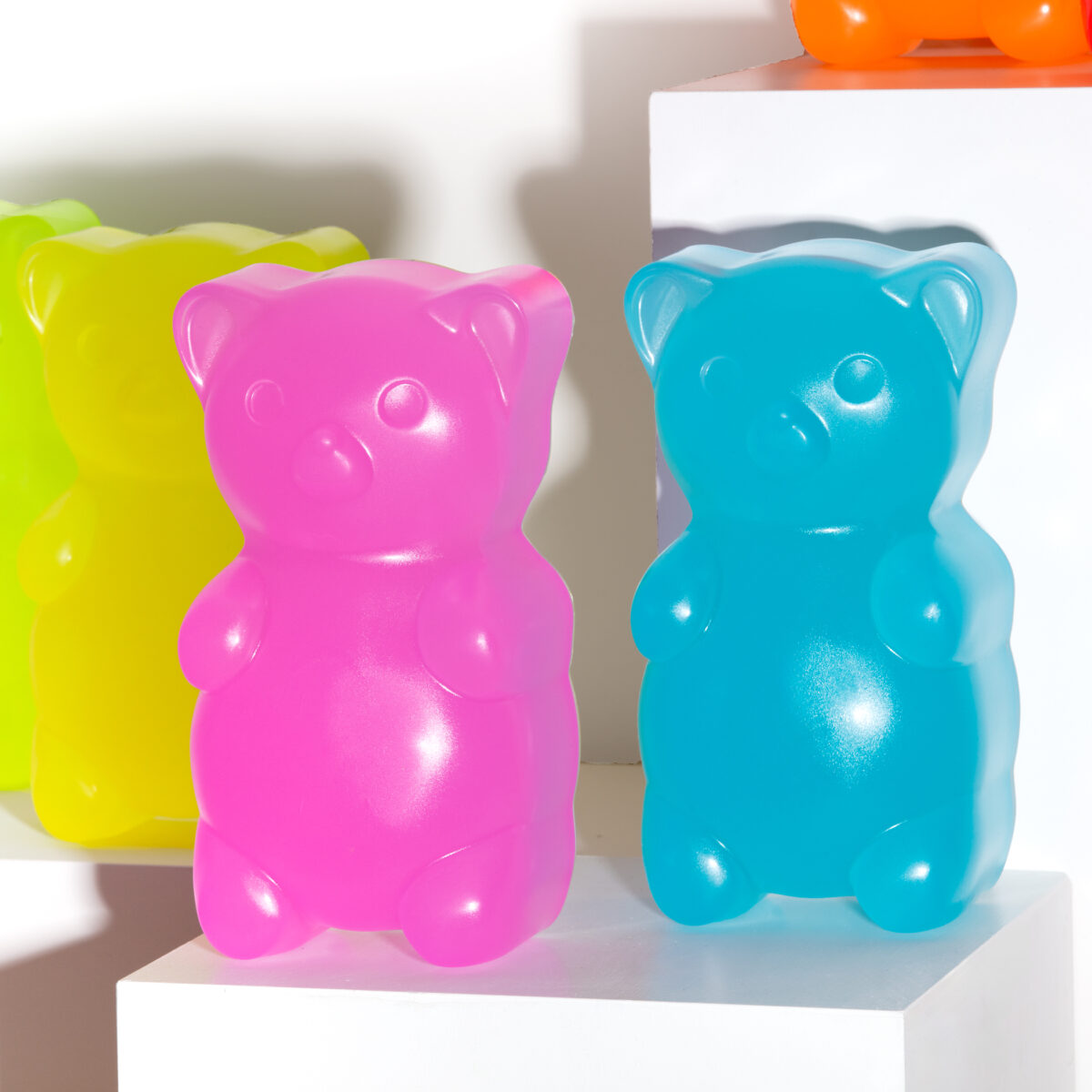 The “YUMMY” series by Anna Sweet explores sculptural mediums and raises the question – “What do we consider to be art, and how do we consume it?” Anna was inspired by the success of Damien Hirst’s “Dot” series, creating a pop art series to reflect the craze that can be the modern art world. This series displays larger-than-life ‘Yummy Bears,’ each displaying extreme craftsmanship and a metaphor for how we consume the art around us. The bears are made from resin and acrylic and measure 10.25″ x 5.5″.