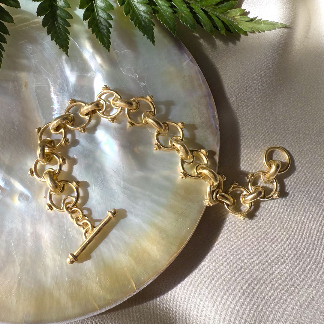 This meticulously crafted ornate chain bracelet embodies timeless design and refined elegance—a true staple for any fine jewelry collection. Each link is individually hand-sculpted and lightly textured, creating a subtle play of light and dimension. Measures 7 inches in length, with resizing available upon request.