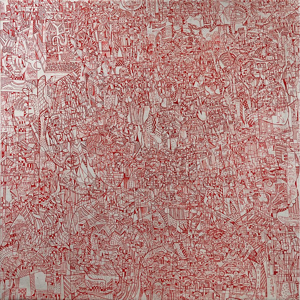Congolese artist Houston Maludi (born 1978) calls his unique style of painting Monochromique Cubism Symbiotique Quantique, his own form of cubism. The artist finds his inspiration in the city, notably the vibrant metropolis of his home in Kinshasa, Democratic Republic of Congo. This is a world filled with an abundance of human activity. This work contain endless details, some of which emerge only with the viewer’s change in perspective. India Ink on Canvas, 80 x 80 cm.