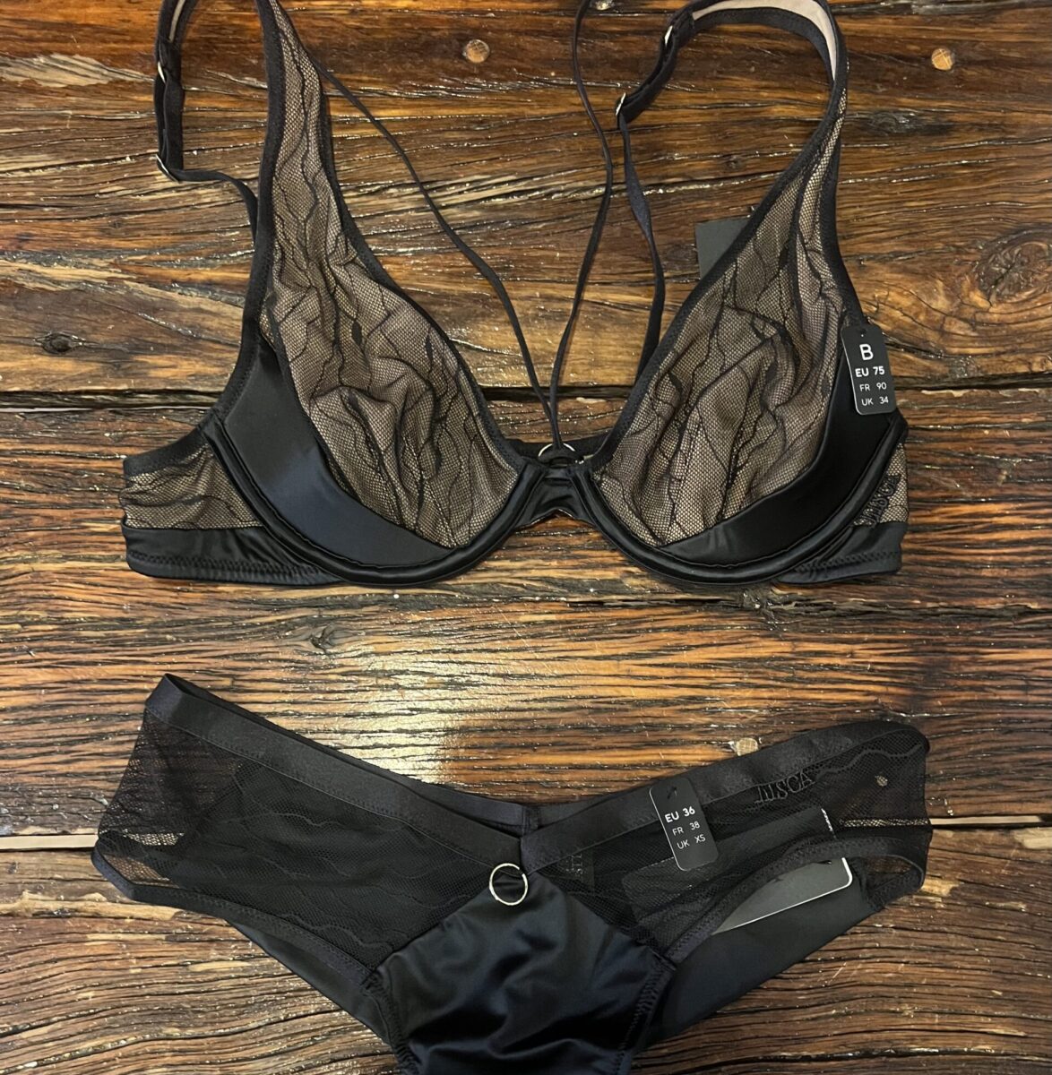 This earring and ring set features Rose baroque pearl and Obsidian.