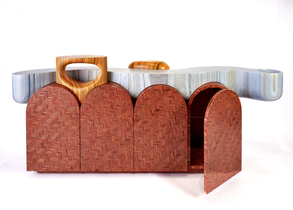 The River is part of the studio’s Nerikomi wood series and is the third rendition of the Nerikomi Sideboard with Plinths. The terra cotta-dyed Nerikomi Sideboard is made from Nerikomi wood material that Trey Jones Studio creates from reclaimed scrap plywood saved from various cabinet shops. It has four doors with glass shelves on the interior. It measures 70″ x 18″ x 30″.