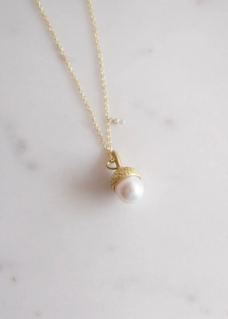 Celebrate the season with this exquisite statement piece from Judi Powers. Featuring a luminous South Sea pearl, sparkling diamond briolette, and rich 18k gold, the necklace echoes the symbolism of the acorn, growth, strength, and possibility, making it a perfect gift for the holidays. Handmade in the Hudson Valley by Judi Powers.