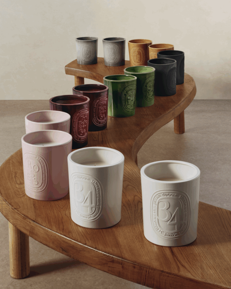 Perfect for indoor or outdoor use, this candle is available in Ambre (Amber), Baies (Berries), Feu de Bois (Wood fire), Figuier (Fig Tree) Roses, Tubereuse, and 34 (Diptyque original boutique scent), and will scent the space within 20 minutes of burning. These candles take 4-6 weeks to make with 120 hours of burn time.