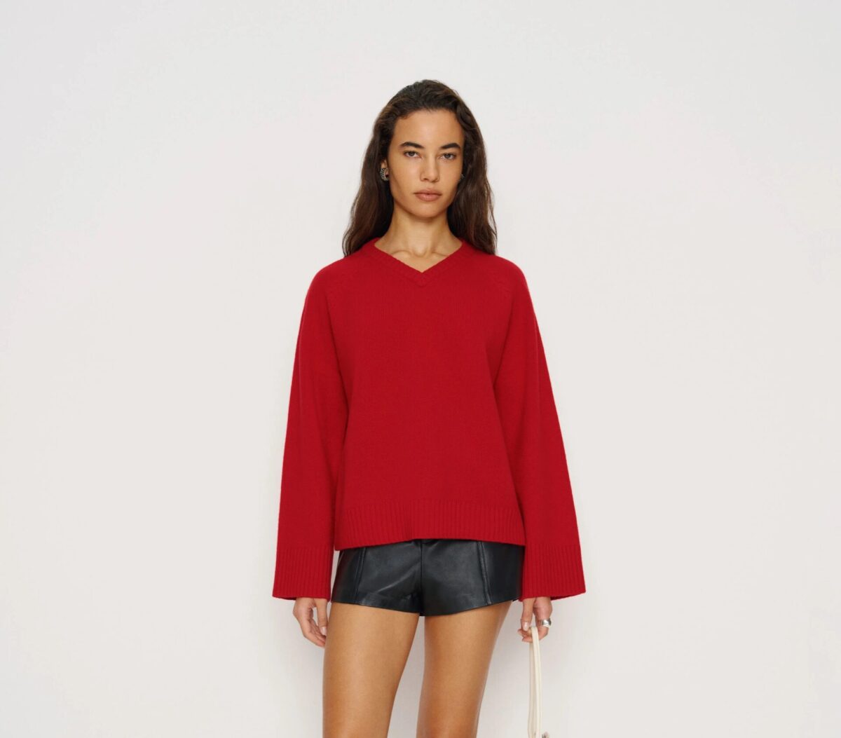 Warm up. Shop the Beth Regenerative Wool V-Neck from Reformation, a sweater with ribbing at the cuffs, hem, and neckline. Easy, but doesn’t look it.