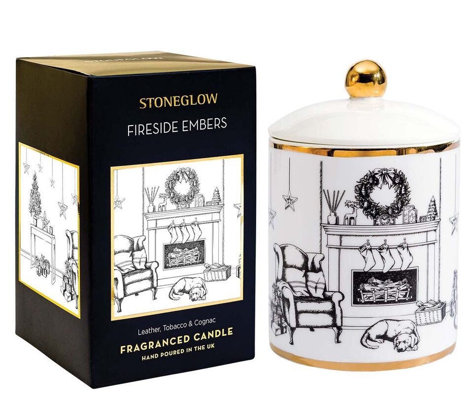 Cozy up with the aroma of warm cognac, leathery notes and smoky woods to create a calm and soothing fragrance reminiscent of evenings spent by an open fire. The ivory ceramic vessel has a hand-drawn illustration of a cozy fireside setting with a Labrador dog snuggling by an open fire, finished off with touches of 22 carat gold.