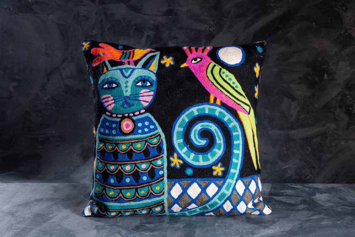 This handmade Cat & a Parrot woolen pillow case measures 18″ by 18.”