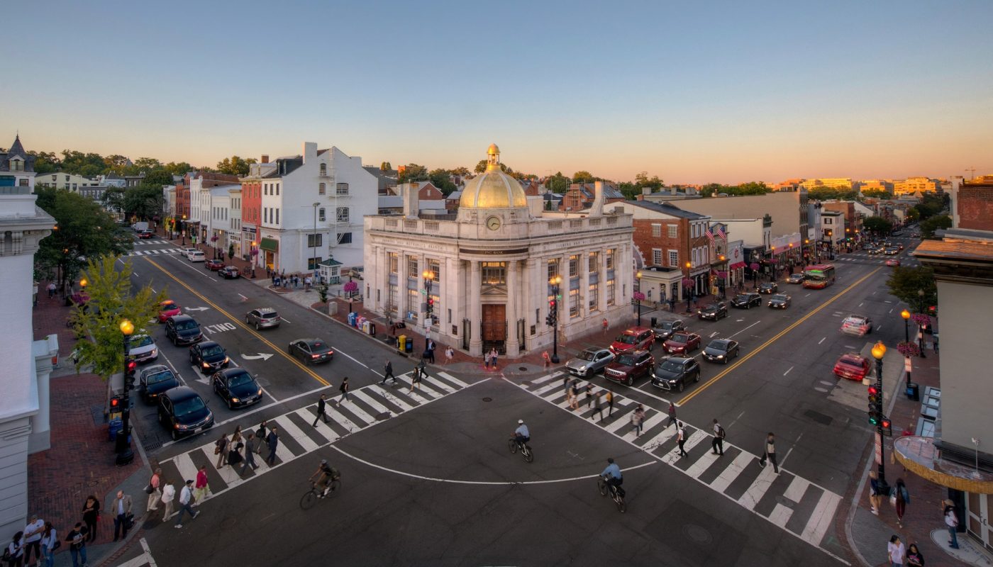The intersection of M and Wisconsin Avenue is the heart of Georgetown, with boutique-lined streets extending in all four directions.
